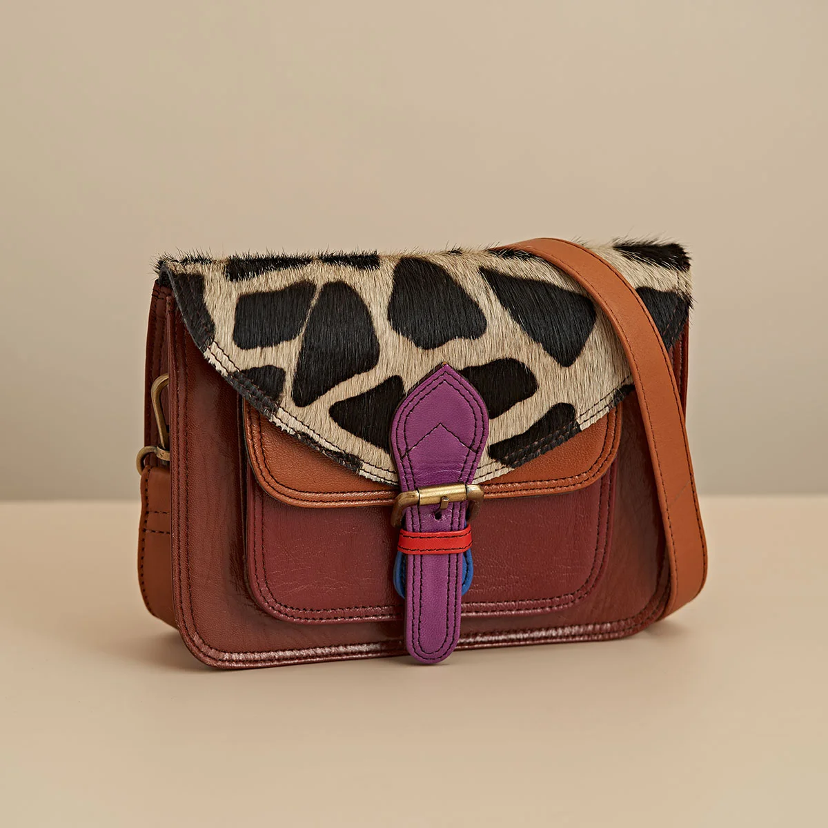 A square satchel style bag, the Beatrice bag has a handy hidden rear zip pocket for your phone, as well as a large stud closing pocket to the front. Inside, there is one spacious compartment, with a full length slip pocket, and a secure zipped pocket. You can wear the Beatrice bag in three different ways – using the adjustable shoulder strap to wear cross body or over your shoulder, or at your waist by using the rear straps to attach to your belt.